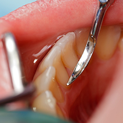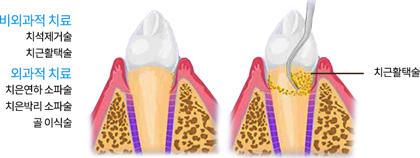 이가 흔들리거나 잇몸에 고름이 있는 경우, 마취 후 잇몸 속까지 기구를 넣어 치료를 하는데 경우에 따라 잇몸을 절개하여 진행하기도 합니다.